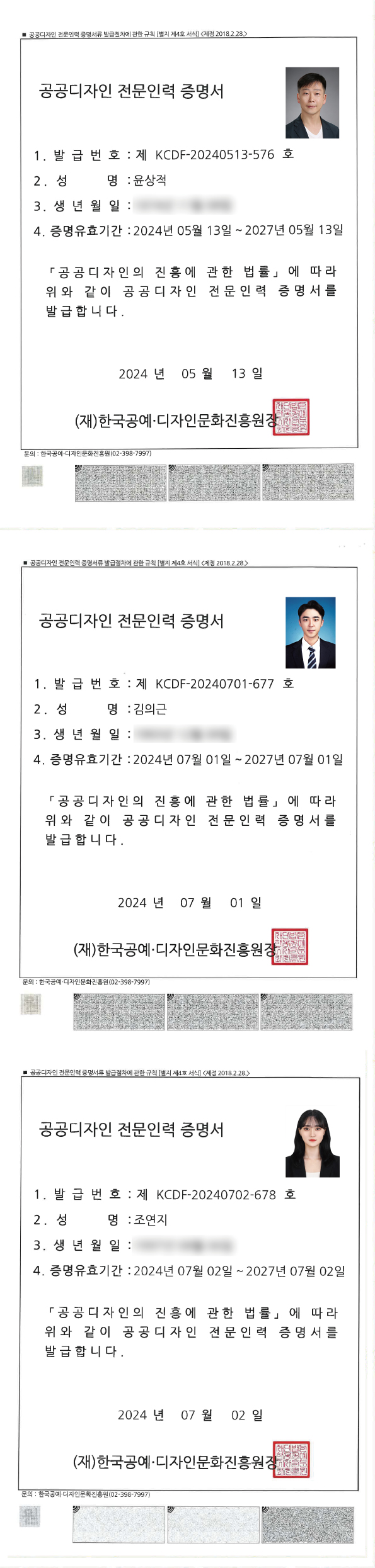[공공디자인 진흥에 관한 법률]에 다른 2024년 공공디자인 전문인력 인증 3인 축하드립니다.