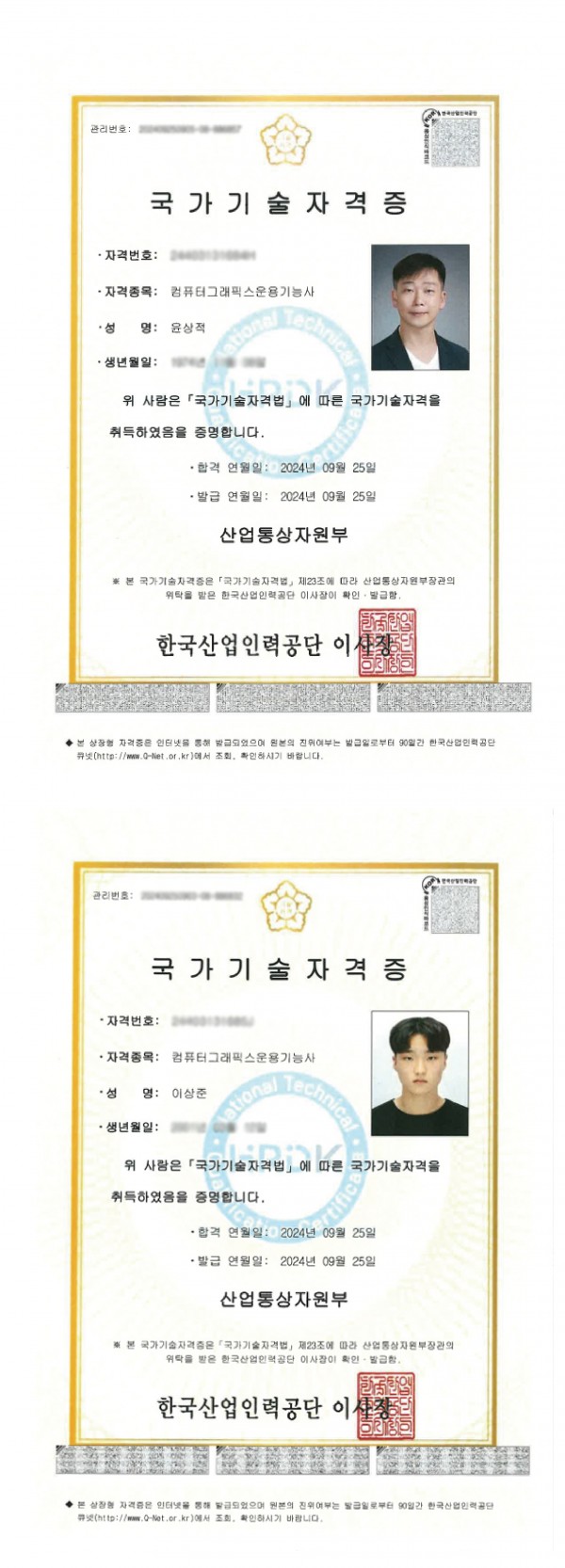축 국가공인기술자격증 취득(컴퓨터그래픽스운용기능사)을 축하드립니다.(2인)