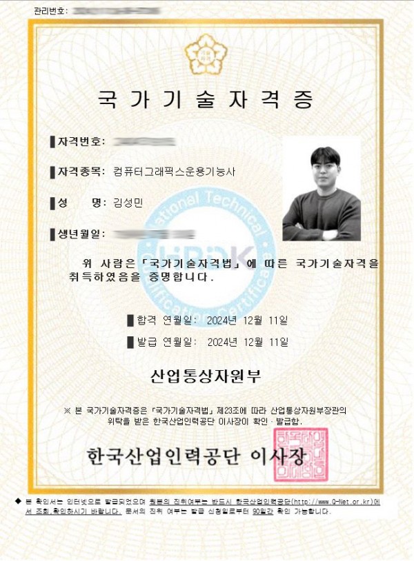 이번 한국산업인력공단 컴퓨터그래픽운용기능사 국가자격을 인증한 김성민 프로님 축하드립니다.