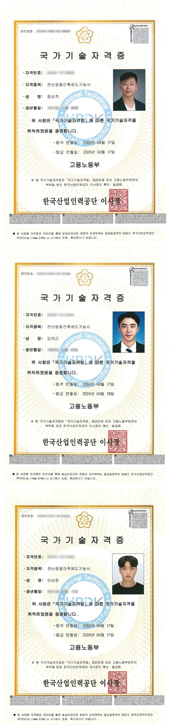 축 국가공인기술자격증 취득(전산응용건축제도기능사)을 축하드립니다.(3인)