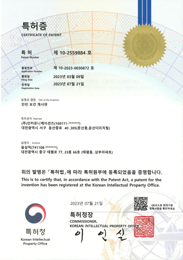 축 특허 제10-2023-0030872호 "안전보건게시판"등록
