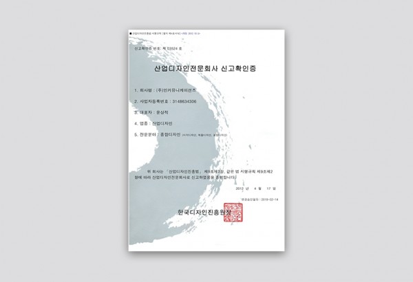 2019.2.14일자로 제품디자인 및 환경,공공디자인을 포함한 종합디자인 회사로 승격하였습니다.